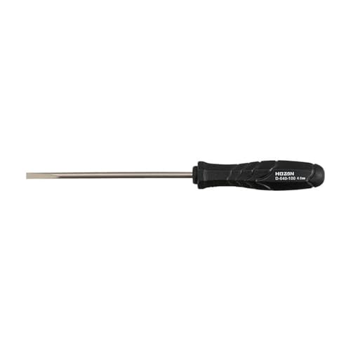 100均ショップのロングドライバーセットの台紙の表示には軸径Φ4と書いてあり、実際軸径は4mmで先端の幅も4mmなのですが、一般的なマイナスドライバーは先端の幅よりも 丸い軸から平らなマイナスの形に変わる部分は先端幅より広くなっています。